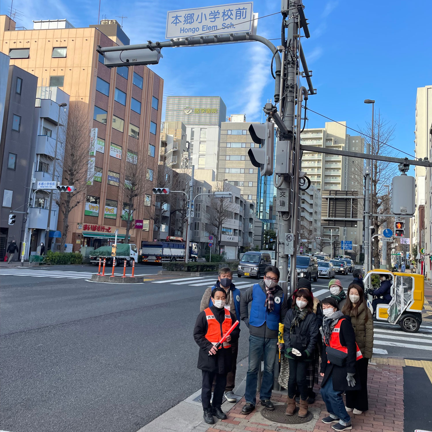 本郷小学校支援地域本部や地元の町会長を始めとする方々からのご要望をいただき、以前には別名で看板が付いていたものの、現状は看板がなかったため、区に申請して「本郷小学校前」の看板を設置しました。