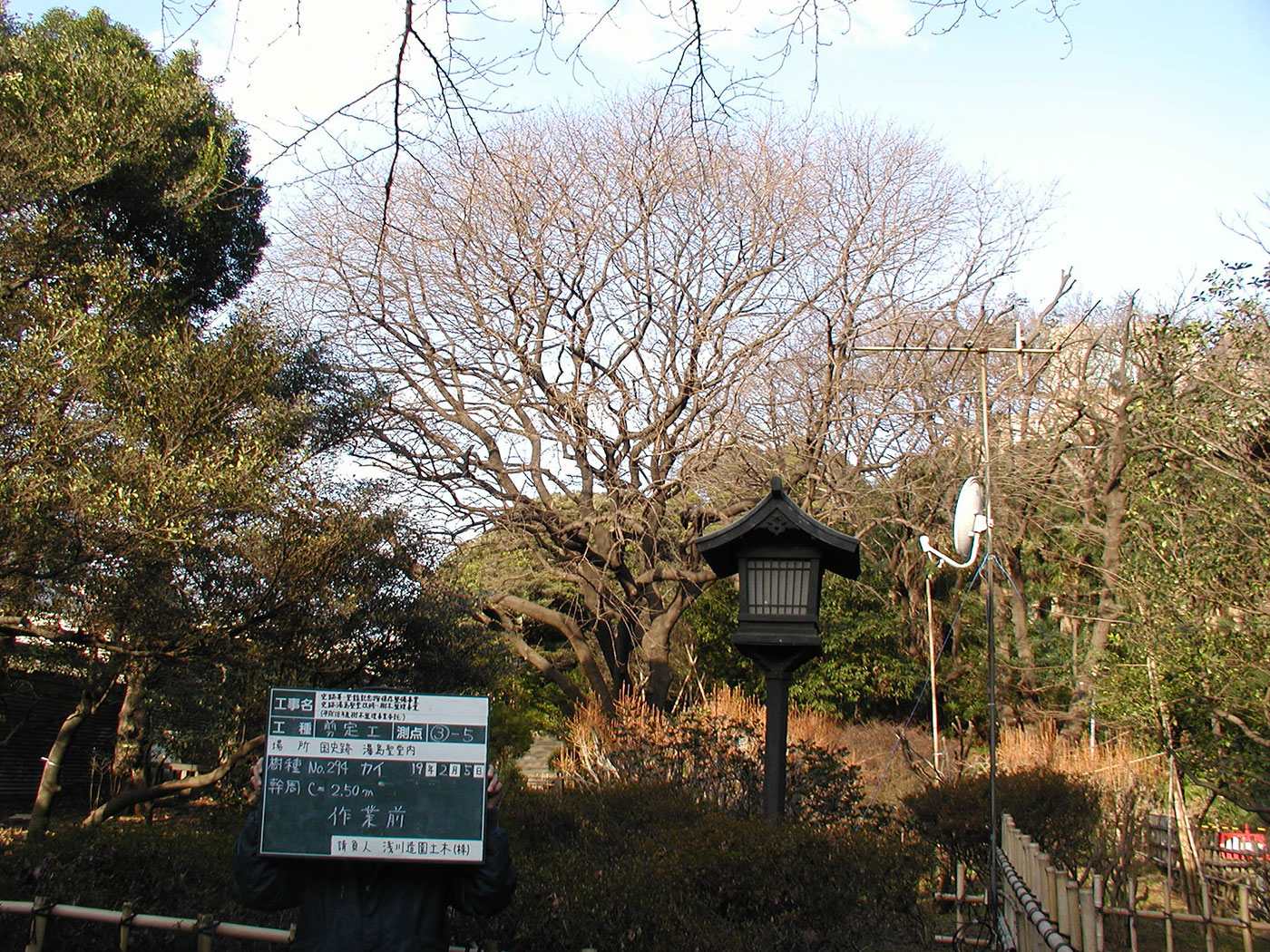 『孔子祭復活百周年記念事業』の一環として、昭和10年湯島聖堂復興時の植栽状況を踏まえ、建造物や施設、あるいは風致を損なう恐れのある樹木を整理しました。概略は、広い敷地を三分割し段階的に伐採や剪定、移植作業を行い整理していくといった内容です。当初の調査では樹高1m以上の樹木が約1、500本存在し、独自の生態系を作り出していました。復興当時の資料に載っていない樹木が多いことから、実生の樹木がこの森の大部分を占めていたことが伺えます。中でも特に大木となった樹種はシイノキ、ムクノキ、クスノキ、トウジュロ、トウネズミモチでした。建物、練り塀、石積み、石段、参道の敷石などを持ち上げ悪影響を及ぼしていたので、この機会に対処できたことは大変有意義であったと感じています。