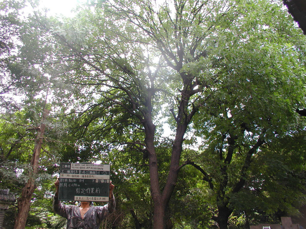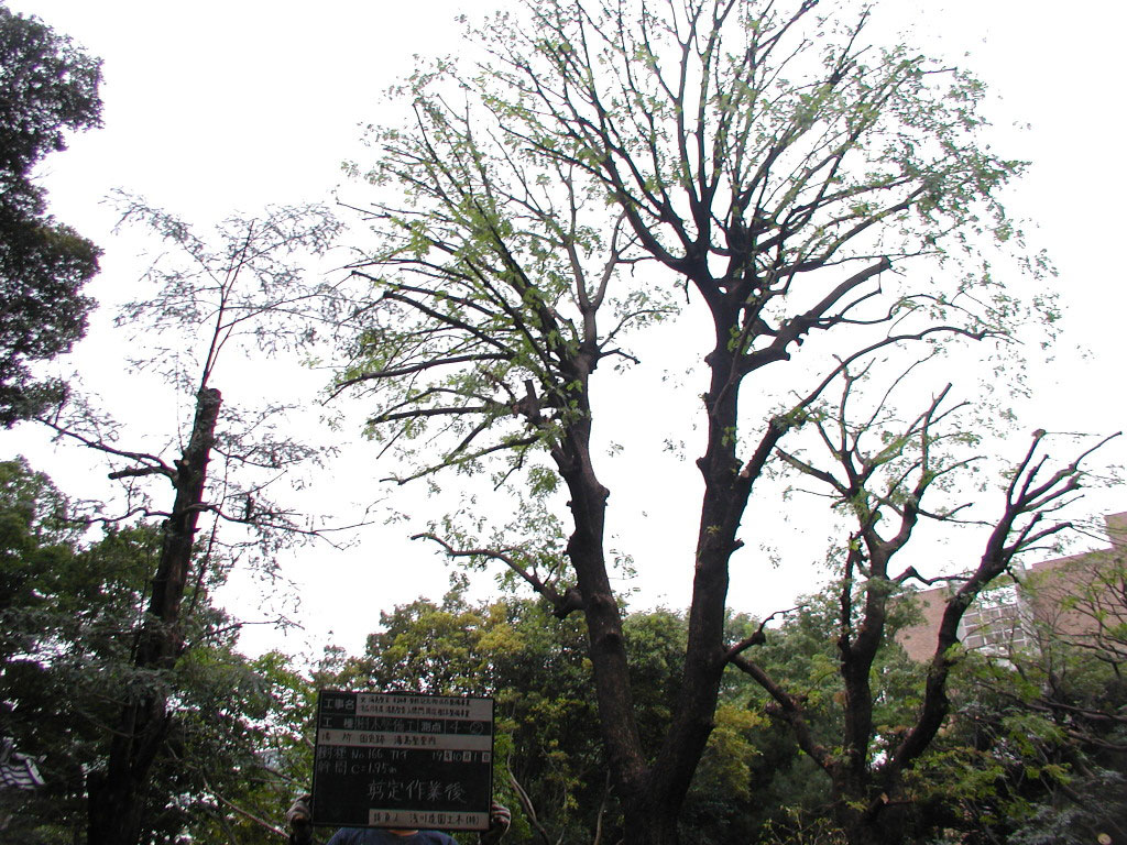 作業にあたっては重機の入らない場所が多く、初めて手を加えたとされる孔子銅像前のカイノキの剪定は、枝先が伸びきった状態で樹幹が大きく広がり足場が悪いため大変苦労しました。また材質が硬く、落葉期の枝先は見た目の倍近い重さで材の密度の濃い枝でした。雌の木ということもあり枝先が垂れ下がる傾向が見られ、秋の結実の重さの影響だと感じました。同敷地内の雄の木は雌とは違い枝先が天に向かって伸びており、丁度イチョウの雌雄の樹形の特徴に類似していました。今回最も驚いたのはトウジュロの生命力です。伐採の時期が良かったせいか、春先には切株の中心から新芽が力強く吹き出し、8割以上が伐採したあと復活していたことです。